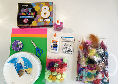 All three Easter crafts activities use: Dot Markers, Paper glue, Paper plates, Colored paper, Googly eyes, Colored feathers, glittery ribbon , a Black sharpie and Toddler scissors. I had also bought pom-pom balls but ended up not using them. I do think you could use them though if desired. The issue is that they are hard to glue.