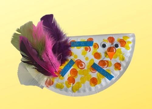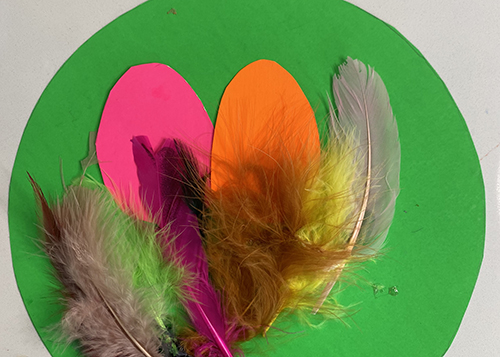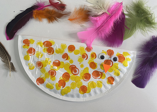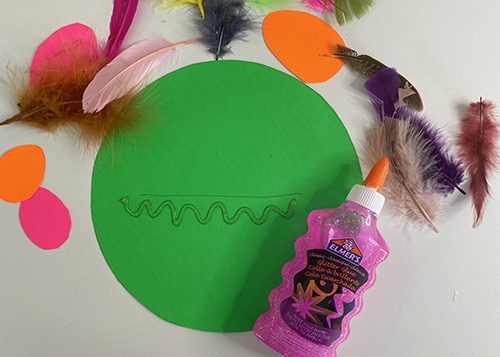 step 5. Add a line of glue a bit below the center of your green circle paper and apply a handful of feathers. (tip: make sure the feathers are not too high up. place paper plate above to check their height in regards to the opening).