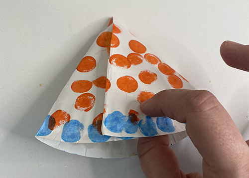 step 2. Fold half the paper plate again and glue the edges. You can also add some more color to the edges if they seem too bare. At this time it is a good idea to place something heavy (like a book) on it and let it dry a few minutes.