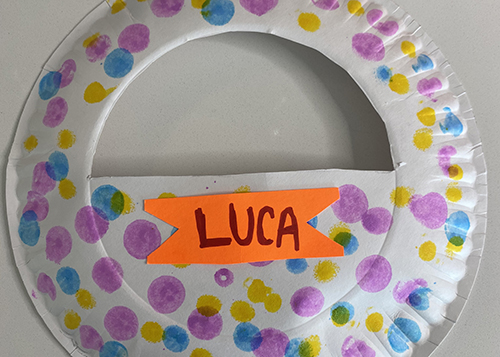 step 8. Glue the smaller eggs to the back side of your paper plate (tip: don’t center them). Add strips of glitter ribbon as desired.